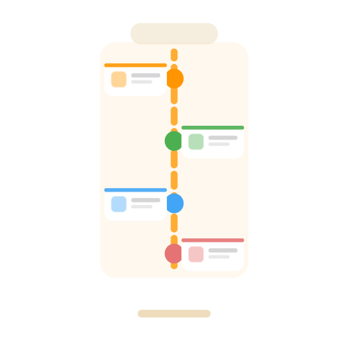 アプリ名・評価・ジャンルを年別タイムラインで表示。 開発者の歩みが一目でわかる。